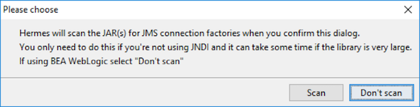 Step 4. Now, add all of the jars in the lib directory of the Solace JMS distribution package, and hit "OK". A confirmation dialog will be presented (see below). Hit "Don't scan" to proceed.