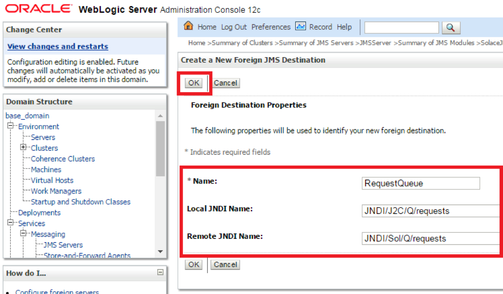 To enable the JMS clients to connect and look up the queue destination required by WebLogic Application Server, there are three JNDI objects required on the Solace event broker: